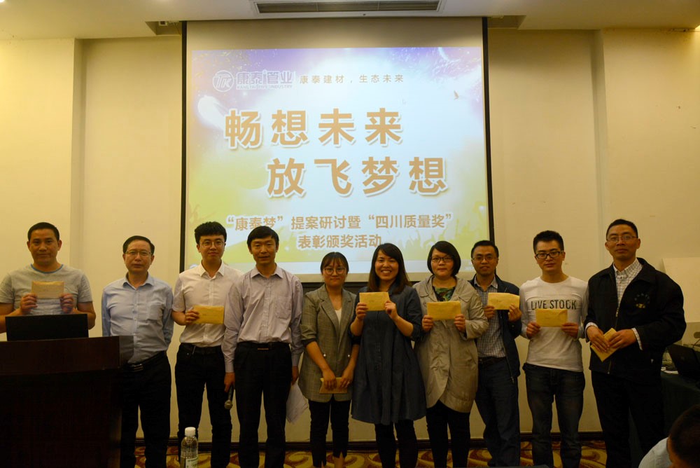 为打造品质康泰,提高市场竞争力和公司美誉度,追逐康泰梦想,增强中高层管理团队凝聚力。5月6日下午,四川质量奖内部表彰暨康泰梦提案揭晓会议在大邑县道源圣城国际大酒店召开。会议由总裁办、市场中心、生产中心、质量中心、技术中心联合主办。康泰集团董事长兼总裁林云青,副总裁郑光铧、张文霖以及母公司中层以上管理人员,各中心参与四川省质量奖申报人员,康泰梦获奖提案和入围提案人员等参加了此次会议。