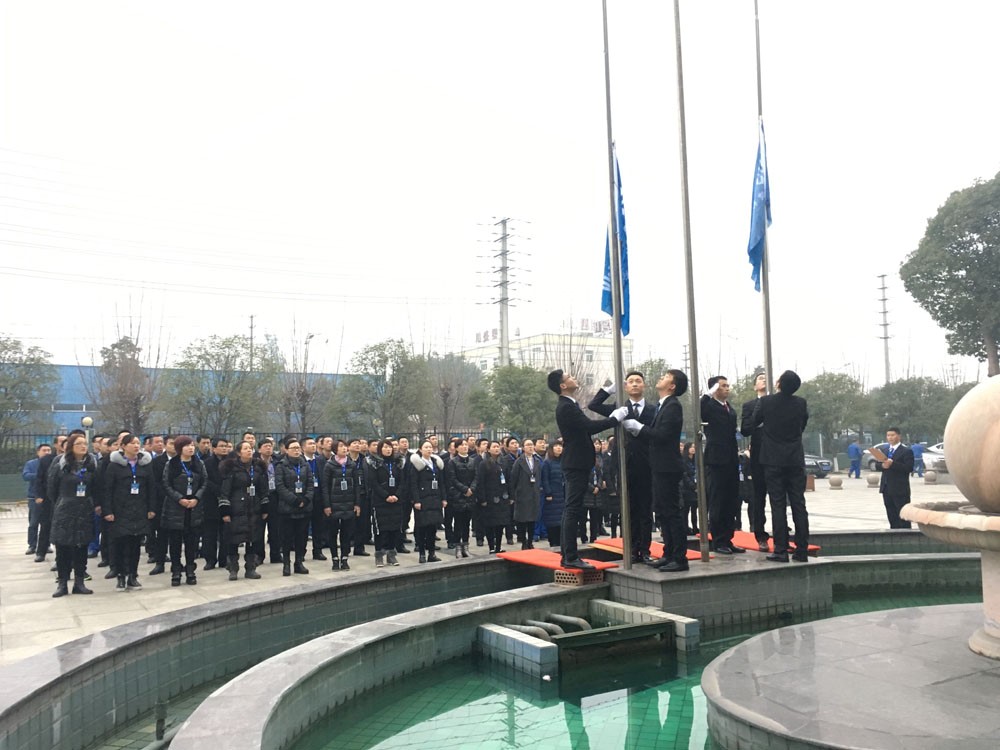 2月13日,新年开工后的第一次早会上,康泰集团在办公楼广场上举行了隆重的新年升旗仪式。集团母公司中高层管理干部、车间主任、行政后勤人员等参加仪式。