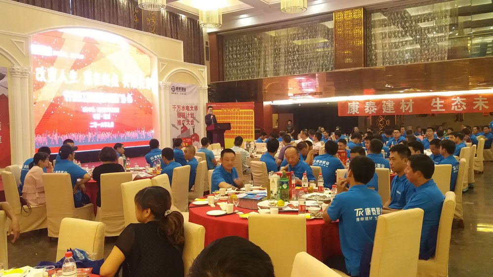 “‘改变人生、赢在起点、共用共享’浙江康泰千万水工锦程计划大型推广会” 9月23日重回主场浙江湖州。这是继江西上饶之后的第三场会议。浙江基地总经理潘明正、集团市场总监郑光铧、集团营销顾问王桢、浙江基地家装部总监王兵、湖州物流中心总经理管俊华等出席会议。湖州区域水电工、部分重点经销商以及浙江康泰销售团队全体人员参加了本次会议。