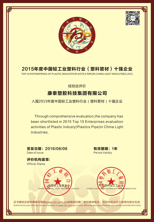 近日,中国轻工业联合会在北京召开了“第五届中国轻工企业家高峰论坛暨百强企业颁奖盛典”,向社会各界发布了“2015年度中国轻工业行业十强企业”荣誉榜单,康泰集团凭借卓越的市场、盈利、质量、研发等能力再度蝉联中国塑料行业(塑料建材)十强。这已经是康泰集团2013、2014、2015连续三年荣登行业十强。