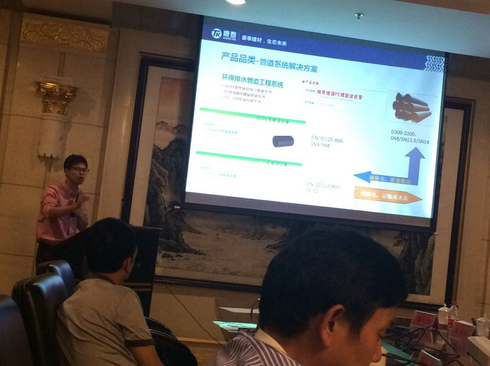 随后由辽宁康泰总经理张文霖作《新产品规划》报告,张总系统介绍了MPE、MPVE®、PE同层排水、特殊单立管、检查井、高层排水HRS等新产品的规划、实施进展和功能卖点,并对产品、材料、技术与营销的结合和市场定位作出阐述,明确今后每年将保持1-2款新产品作为康泰独有领先的技术支持,不断打造、提升康泰的技术研发能力,充分实现技术、创新推动发展,打造产品对市场、营销的支撑力。