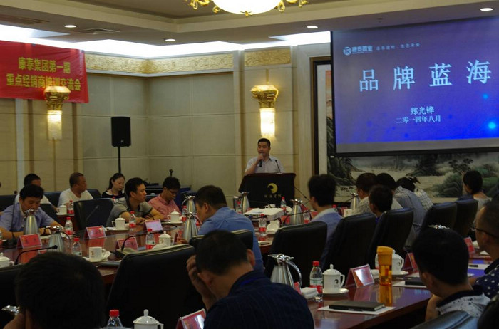 接着由集团总裁特助兼品牌总监郑光铧作《品牌蓝海》报告,郑总系统的从行业整体形势、集团顶层设计、品牌塑造、蔡总的成功经营模式与系统思维、新经销商思维、企业与经销商专业分工系统阐述汇报,最终聚焦在品牌蓝海为新的发展动力和引擎。郑总在2个小时的汇报中强调康泰集团一定要建立在内部强大基础上的全面品牌塑造战略与规划,以立体、多元素的品牌塑造,明确康泰集团就是要成长为生态建材行业领导者品牌,做不了第一、做唯一,逐步跳出价格战、全面向品牌营销、价值营销的蓝海突围。要求经销商要清晰定位、打开思维、转变思路,树立信念、强大内心,发挥团队、练好基本功,紧跟康泰的发展,大洗牌期间健康的活着,扩大市场份额,蓄势待发,大洗牌结束,再次发展腾飞。共同努力实现康泰集团全面品牌化、规范化、规模化的战略目标,发展共赢。