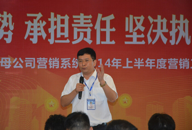 7月11日8:20,母公司营销系统全员个个精神饱满、神采奕奕,在高亢激昂的《康泰之歌》中开启全天总结汇报会议,成都、四川、重庆、云南、西安商务部、网络部、市政部、家装事业部、型材事业部、大客户部十个团队,分别就2014年上半年度工作总结、下半年度工作规划作出汇报。最后由营销中心何朝晖总监作营销中心上半年度总结、下半年度形势分析和工作规划部署,何总首先对各团队负责人的工作汇报和规划作一对一的详细点评和指导,并在总结中说道:“上半年营销中心全员团结一致、全力以赴,完成了上半年度的目标,可喜可贺。但要清醒看到房地产市场重大拐点的严峻形势,完成下半年销量指标充满挑战,要求营销系统全员统一思想,坚定以认清形势、承担责任、坚决执行、挑战发展的思路,将每项工作落到实处,奋力拼搏争取圆满完成下半年经营指标” 。