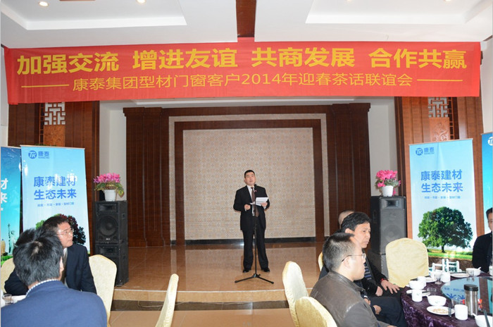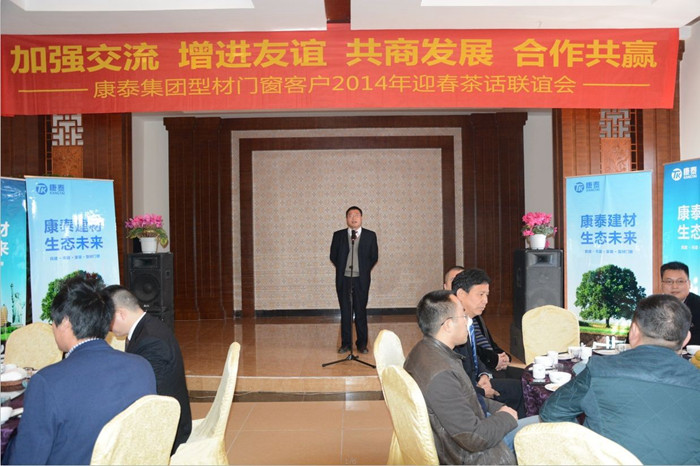 当日,以“加强交流、增进友谊、共商发展、合作共赢”康泰集团型材门窗客户2014年迎春茶话联谊会在美丽的街子古镇味江味花园饭店隆重召开,一百多名客户参加了此次联谊会,集团公司林总裁、品牌总监郑光铧、型材事业部总经理陈彪出席本次联谊会。