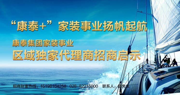 “康泰+”家装事业现已面向全国诚招区域独家代理商,选择康泰,与康泰同行,您不再孤军奋战,因为有康泰集团坚实后盾,有一支高效率的营销团队时刻准备着为您服务,您的事业我们全程陪伴、共同前行!现区域独家代理首次全线开放,独霸一方的市场机会仅有一次,全城独家代理商仅有一席,请您亮剑!