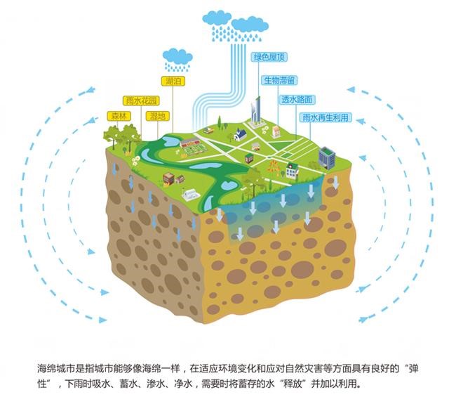海绵城市是指通过建设绿色屋顶、可渗透路面、下凹式绿地、城区河湖水域和污水处理设施等,加强城市对自然灾害的承载力,下雨时吸水、蓄水、渗水、净水,需要时将蓄存的水“释放”并加以利用。当然,实现“海绵城市”的前提是,城市里拥有强大的雨水快速收集、排放管网系统。