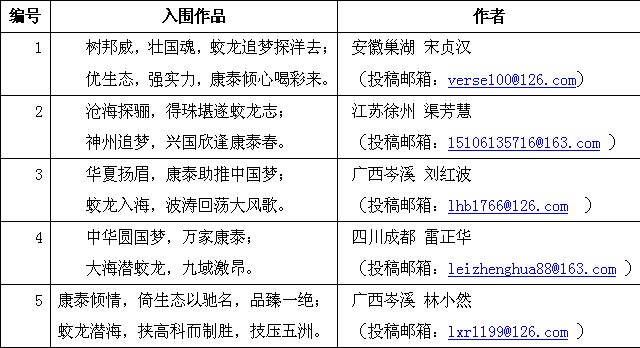 由康泰塑胶科技集团公司特邀书法家林峤先生、楹联家罗永嵩先生发起的“为蛟龙号献礼”对联征集活动从2014年6月5日开始,至2014年6月14日截止,历经10天活动组委会通过企业邮箱(ktjt@ktsj.com.cn、ktsj@ktsj.com.cn)、“康泰塑胶集团”新浪官方微博、“康泰塑胶集团”官方微信订阅号三种投稿渠道共征集到有效对联作品373幅,现经书法家林峤先生、特邀楹联家罗永嵩先生以及康泰集团领导组成的评审组依据题材切中、寓意内涵、平仄押韵、节奏相应等标准对投稿作品进行层层筛选,本着作品充分表达“蛟龙号尖端科技实现中华强国梦;康泰生态建材实业兴邦;对联国粹彰显爱国情怀”的重大意义与内涵,最终产生5幅入围奖作品,现将名单公布如下(作品排名不分先后):