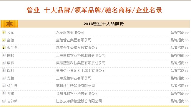 2014年6月,由品牌排行网主办的“2014年度中国管业十大品牌评选” 活动于6月26日完美降下帷幕,康泰塑胶科技集团有限公司荣膺“2014年度中国管业十大品牌”。本次活动以稳定大型企业发展、带动行业品牌化发展为目标,以促进民族品牌为主题,面向所有行业所有品牌开放,公开评选。本次评选异常火爆,不但吸引了国内近一半的管业品牌和经销商的参与,同时,也被新浪、网易、人民、新华、中国网等70多家知名网络媒体高度关注,是国内管业行业少有的大型权威品牌评选活动。中央电视台、人民日报等权威媒体更是争相报道。本次评选,不但成为管业领军者齐聚的盛会,更是众多国内优秀品牌崭露头角,表现自我的绝佳机会。经过紧张激烈的网上投票、资质审核以及消费者商誉评价。